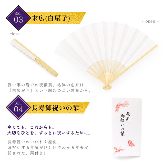 セット内容は【ちゃんちゃんこ・大黒頭巾・末広・長寿お祝いの栞】です。
