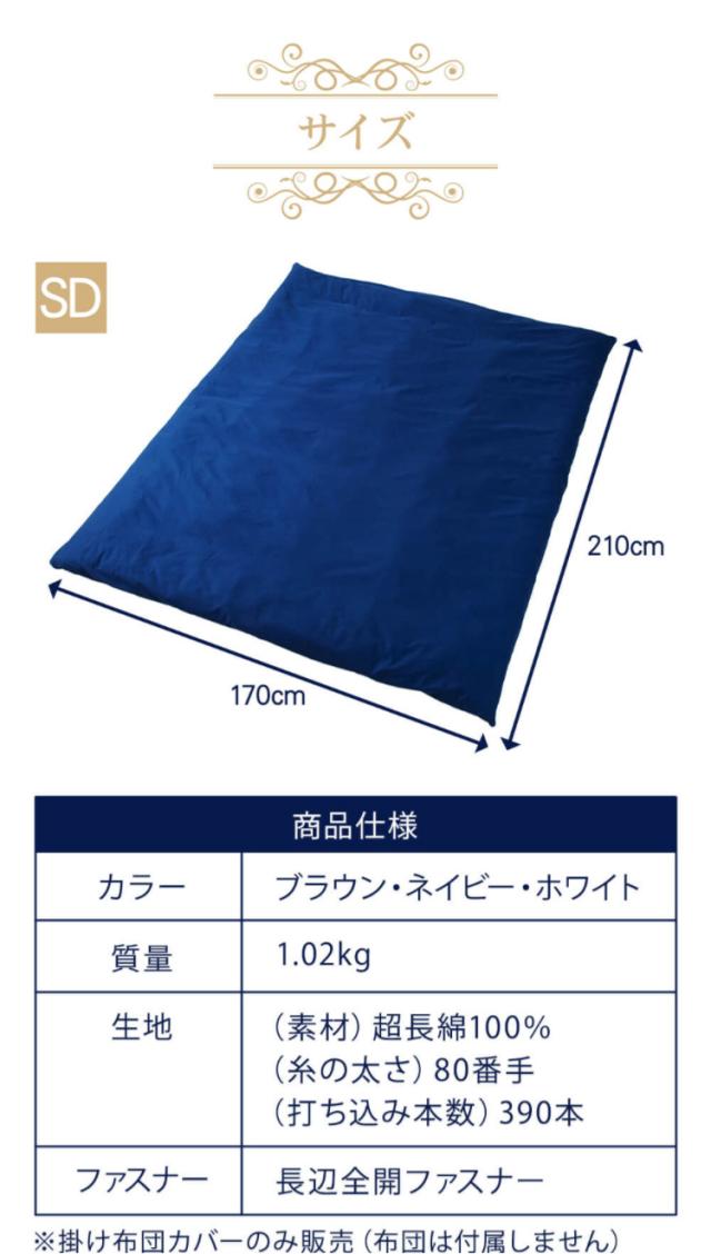 プレミアムコットンを使用した、なめらかな肌触りと光沢が特徴の掛布団カバーです。
