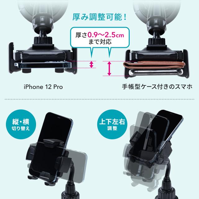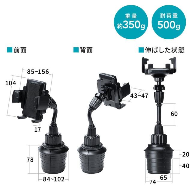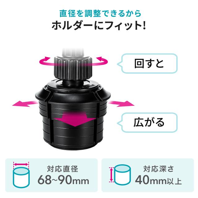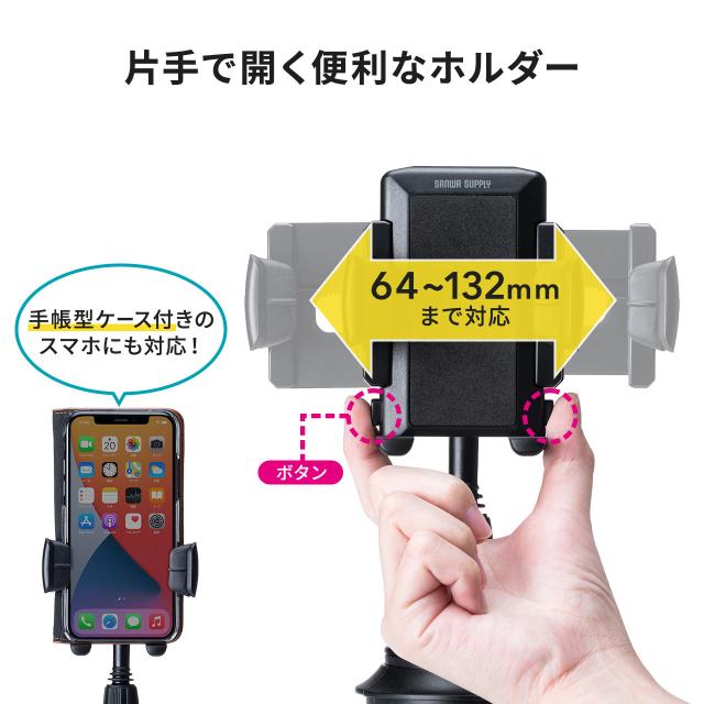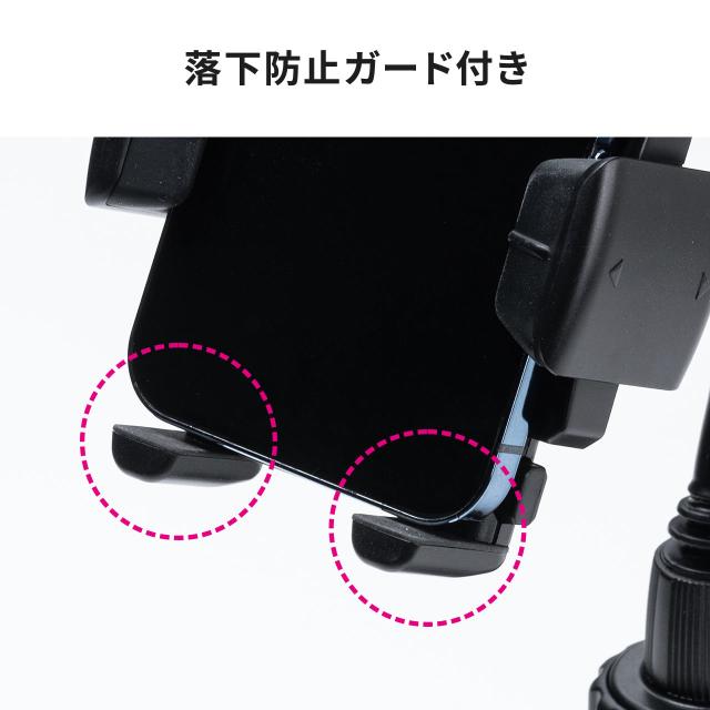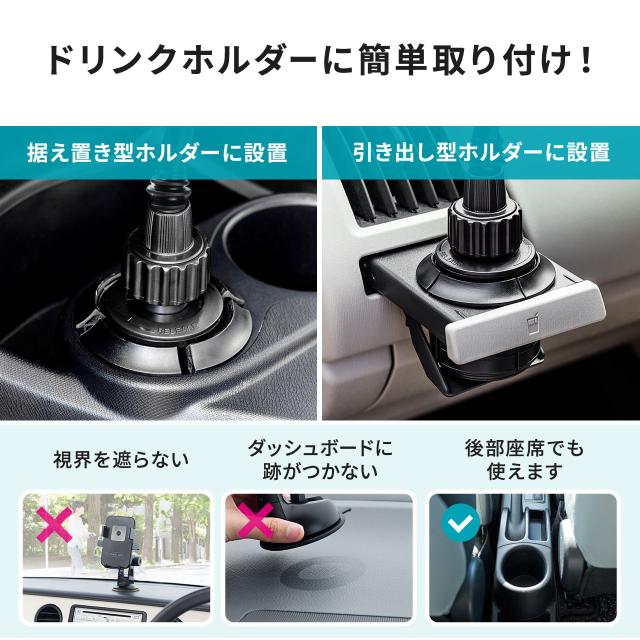 ■対応機器:幅64〜132mm、重量500g以下のスマートフォン・フィーチャーフォン■対応ドリンクホルダー:内径68〜90mm、深さ40mm以上のドリンクホルダー