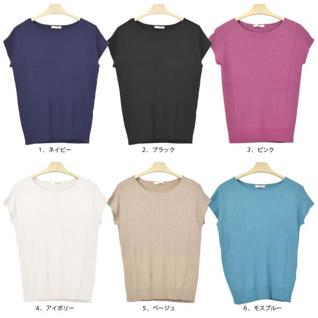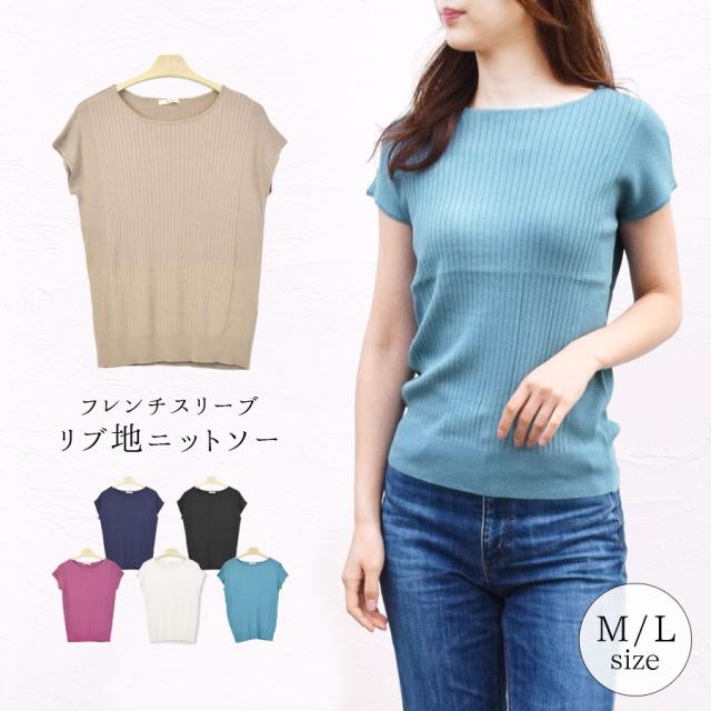 【07-22】【ニット レディース 半袖 カットソー ニットソー ニットカットソー リブ 薄手 無地 フレンチスリーブ スリム タイト 細身 カジュアル シンプル 黒 白 オフィスカジュアル オフィス】