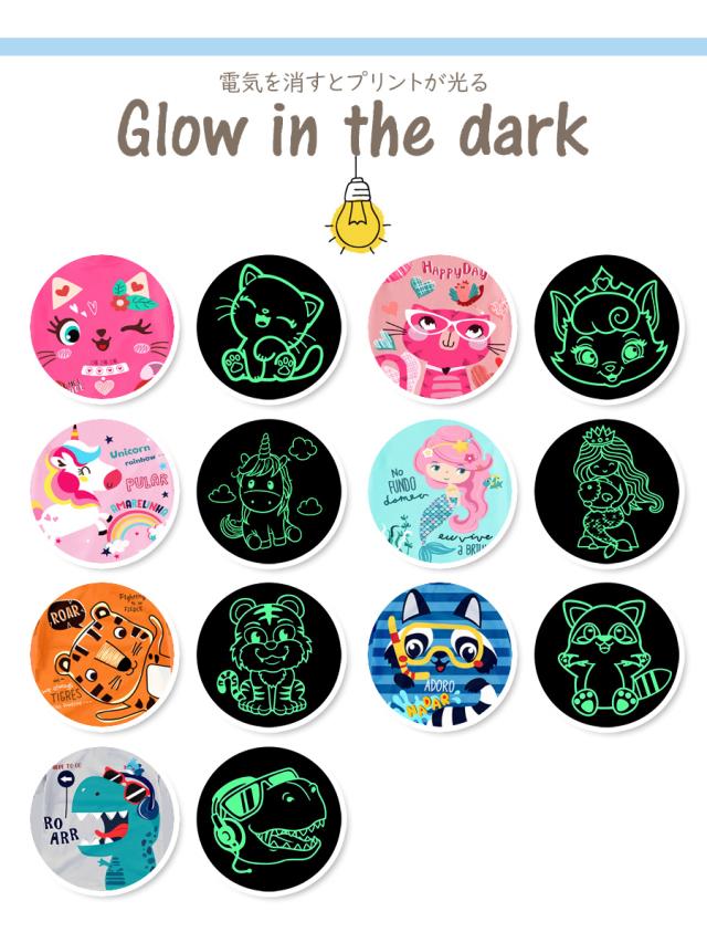 光るプリントのパジャマとは、明るい所で光りを溜めておくと、暗い所で蓄光プリントが光る、こども達にもママ達にも大人気のパジャマです。