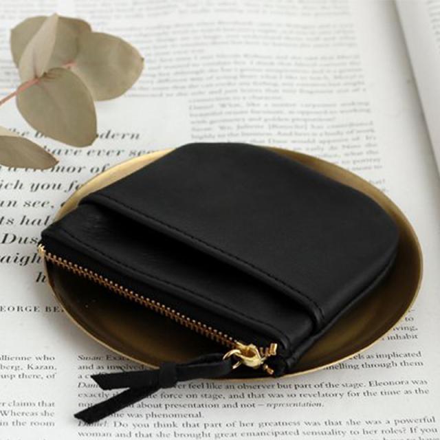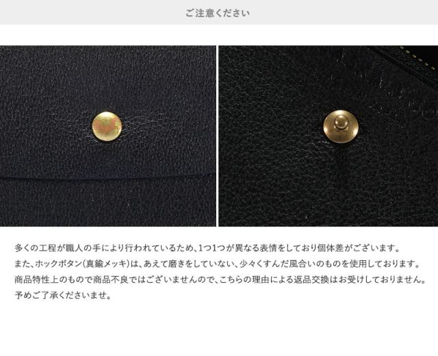 素材にはゴートスキン(ヤギ革)を使用。シボの入り方がごく細かく、上品な質感。触り心地がさらっと軽くしなやかながら、丈夫なのが特長です。表側の控えめな艶と裏側のマットな質感の対比がシックな雰囲気です。ゴールドのファスナーやスナップボタンの輝きが、さりげないエレガンスを添えています。