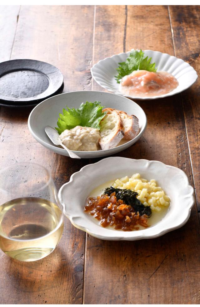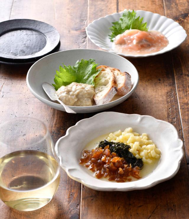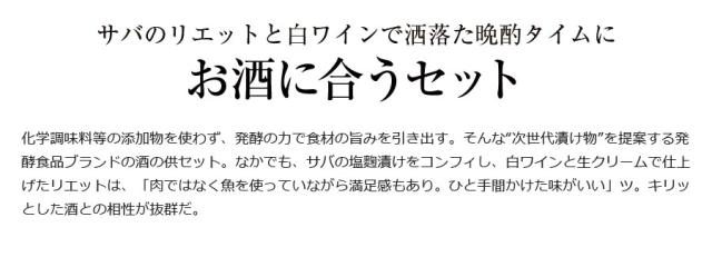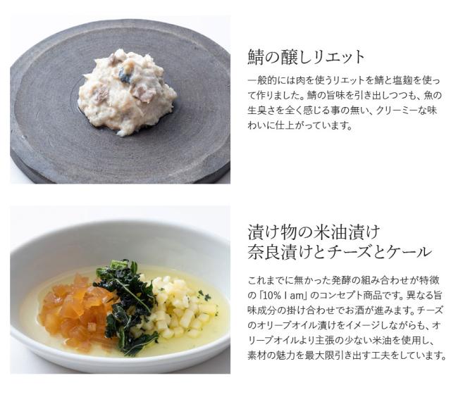 化学調味料等の添加物を使わず、発酵の力で食材の旨みを引き出す。そんな「次世代漬け物」を提案する発酵食品ブランドの酒の供セット。なかでも、サバの塩麹漬けをコンフィし、白ワインと生クリームで仕上げたリエットは、「肉ではなく魚を使っていながら満足感もあり。ひと手間かけた味がいい」。キリッとした酒との相性が抜群だ。