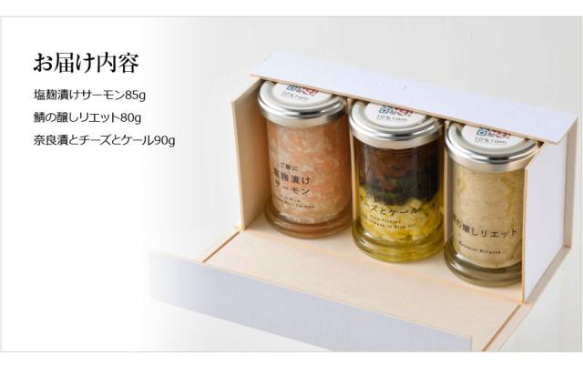 ○内容量:塩麹漬けサーモン85g、鯖の醸しリエット80g、奈良漬とチーズとケール90g