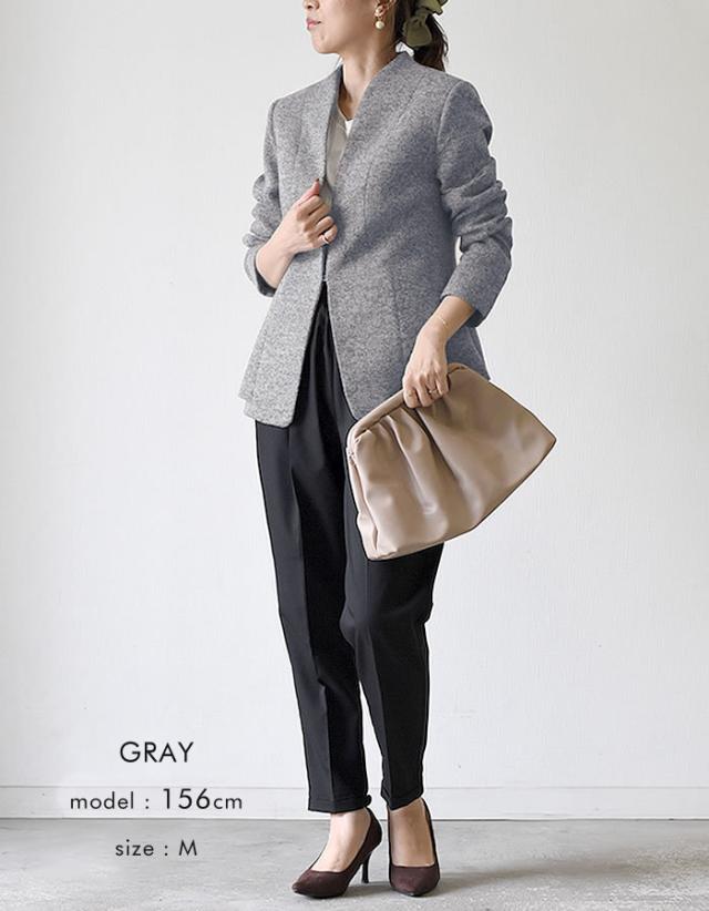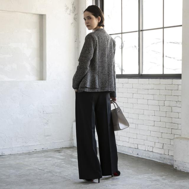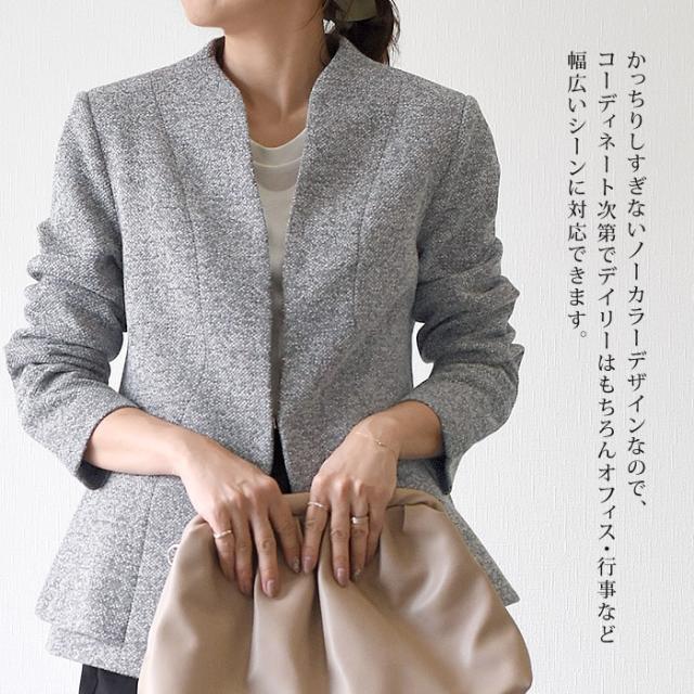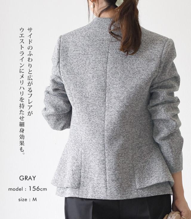 大人っぽく女性らしいノーカラーのペプラムジャケットは