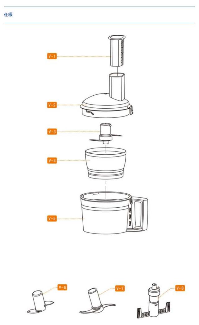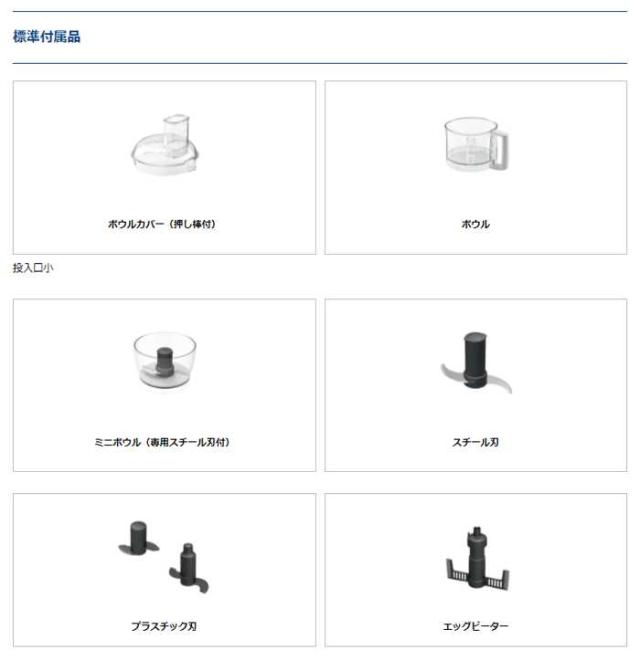 ■標準付属品:ボウルカバー(押し棒付)、ボウル、ボウル、ミニボウル(専用スチール刃付)、ミニボウル(専用スチール刃付)、スチール刃、スチール刃、プラスチック刃、プラスチック刃、エッグビーター、エッグビーター