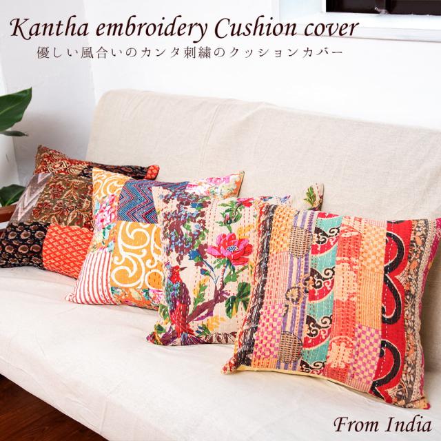 カンタ刺繍とウッドブロックプリントのクッションカバー / コットン パッチワーク アジアン インテリア エスニック