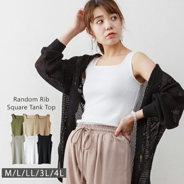 冬新作 大きいサイズ レディース ランダムリブスクエアタンクトップ ノースリーブ 無地 カジュアル Uネック シンプル コットン クルーネック(丸首) デコルテ見せ プチプラ