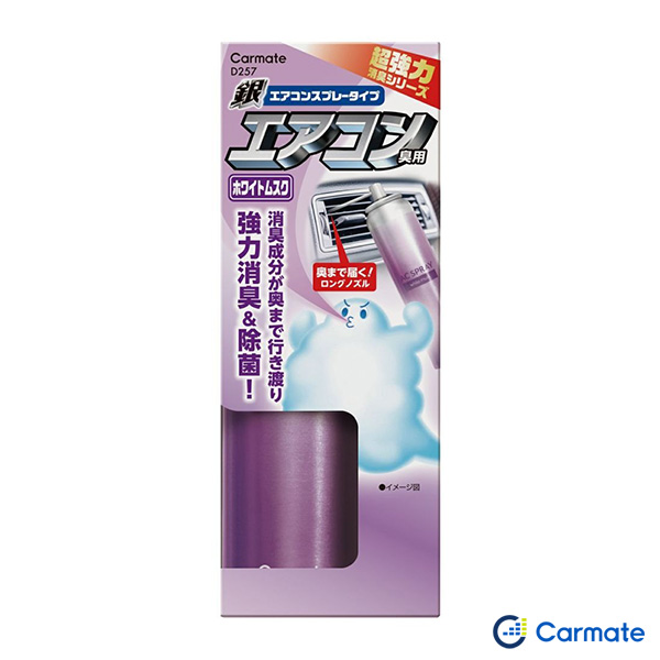 カーメイト 超強力エアコンスプレー消臭 銀 ホワイトムスク 車用 奥までロングノズル 除菌 カビ ウイルス等 D257