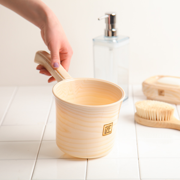 柔らかい色彩の木目調の模様が特徴的な手桶です。暖かみのある木目調は優しい雰囲気でどんなバスルームにもぴったりです。リアルな木目模様は表面だけの着色ではないので、消えたりめくれたりしにくいです。