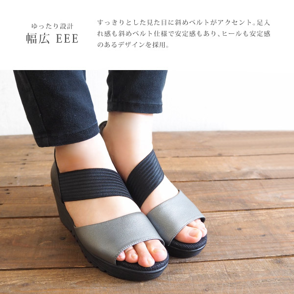 すっきりとした見た目に斜めベルトがアクセント。足入れ感もゴムの斜めベルト仕様で履きやすさと、ヒールはウエッジソールの安定感のあるものを採用。ゆったり3E設計もうれしいポイントです。