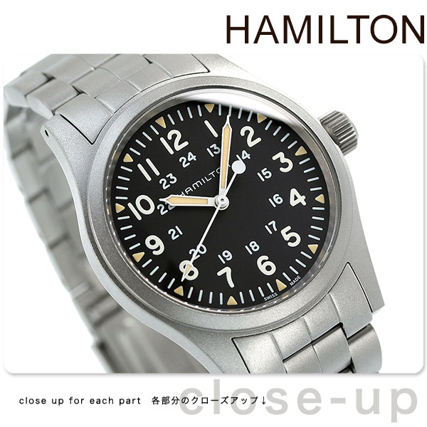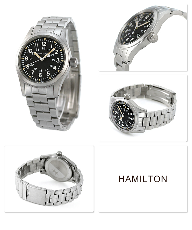 3年保証キャンペーン ハミルトン カーキ フィールド メカニカル 38mm スイス製 手巻き メンズ 腕時計 H69439131 HAMILTON KHAKI FIELD MECHANICAL アナログ ブラック ◆HAMILTON(ハミルトン)はアメリカ発祥の老舗ブランドです。創業翌年に誕生した懐中時計「ブロードウェイ・リミテッド」は、他の時計よりも正確に時を刻むことから鉄道用時計として採用されました。その後も航空用時計や軍用時計として採用されるなど、品質の高さと流行にながされない独自のデザインが世界中の人々に支持されています。 1960年年代のオリジナルモデルを忠実に復刻、ハミルトンのミリタリーウォッチの歴史を色濃く反映しています。ミリタリールーツに根ざしたた機能美を感じさせるタイムピース。軽快な付け心地のステンレススチールブレスレットでスポーティーなスタイルが魅力です。 機械式腕時計