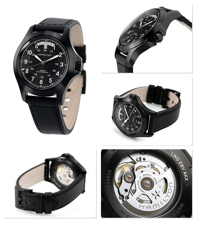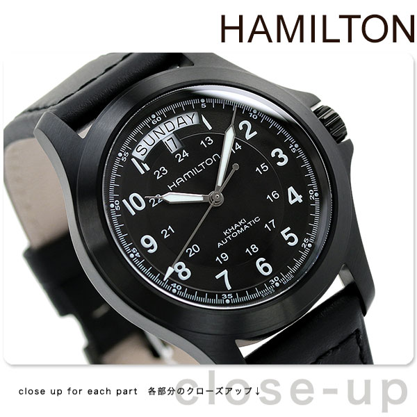 3年保証キャンペーン ハミルトン カーキ フィールド キング オート 40mm スイス製 自動巻き メンズ 腕時計 H64465733 HAMILTON KHAKI FIELD KING AUTO アナログ オールブラック 革ベルト ◆HAMILTON(ハミルトン)はアメリカ発祥の老舗ブランドです。創業翌年に誕生した懐中時計「ブロードウェイ・リミテッド」は、他の時計よりも正確に時を刻むことから鉄道用時計として採用されました。その後も航空用時計や軍用時計として採用されるなど、品質の高さと流行にながされない独自のデザインが世界中の人々に支持されています。 ミリタリーにインスパイアされた計時機能が特徴的なKHAKI FIELD KING AUTO。12時位置に日付と曜日を表示。存在感あふれるりゅうずプロテクターを採用、デザイン性にも優れています。スーツスタイルからカジュアルスタイルまで、幅広いファッションに合わせてお使い頂けます。 機械式腕時計