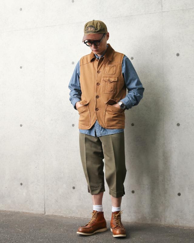 ウール混のギャバジン素材で独特のごわつき感もなくとても着やすい1本です。七分丈のパンツで非常にオシャレ!本来裾には編み上げの紐が付いているのですが、USEDのため欠損しています。靴紐やパラコードなど紐であれば代用も可能です。ブーツ、スニーカー、サンダルと正直靴は何でも合わせやすく、シルエットもデザイン性もよく長くつきあえるパンツだと思います。