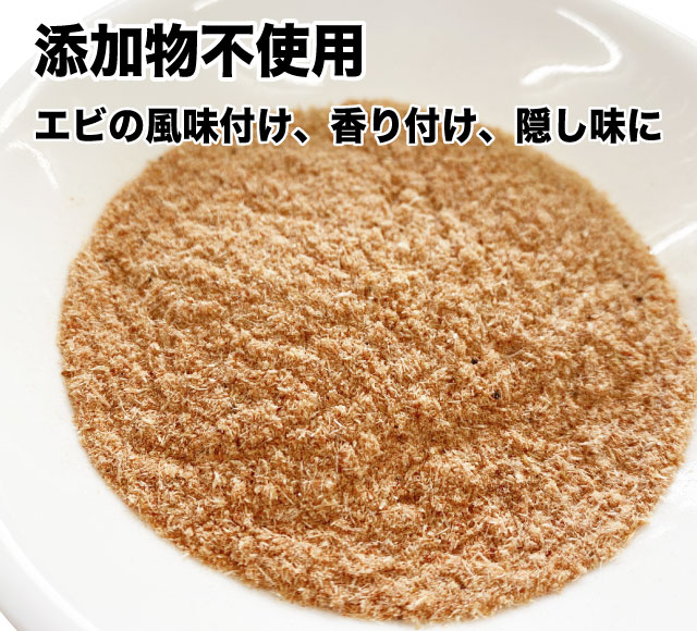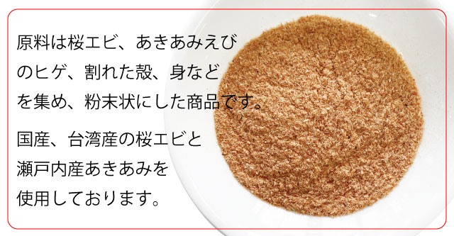 桜エビ(国産、台湾産)、あきあみ(瀬戸内産)のヒゲ、割れた殻、身を粉末状にした商品です。