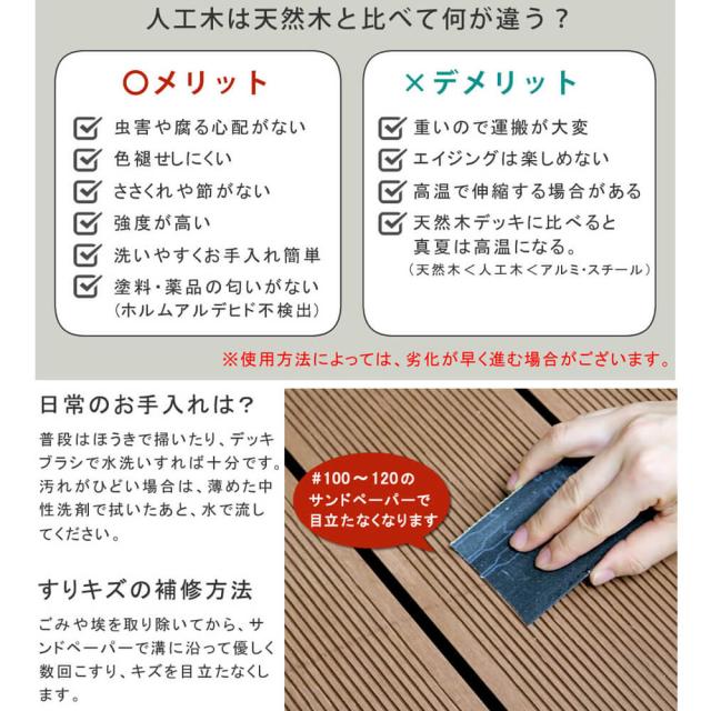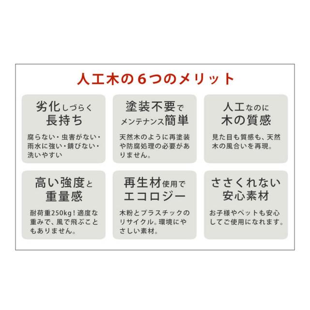 ※人工木は高い強度がありますが、鋭利なものなどで強い衝撃を与えると、割れやへこみが生じることがありますのでご注意ください。