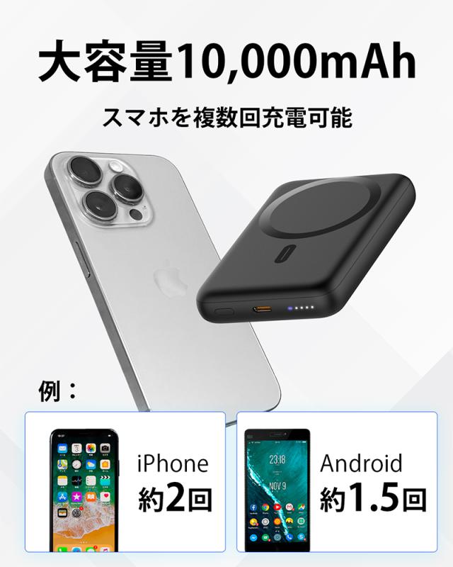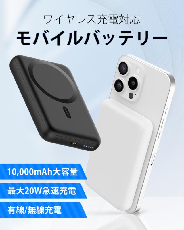 モバイルバッテリー ワイヤレス充電 大容量 急速充電 小型 薄型 10000mAh 充電器 スマホ 充電器 LED 残量表示 充電 軽量 小型 携帯 バッテリー スマホ充電器 持ち運び 緊急用必携品 iPhone/iPad/Android対応 PSE認証済 2026 ブラック ホワイト 黒 白