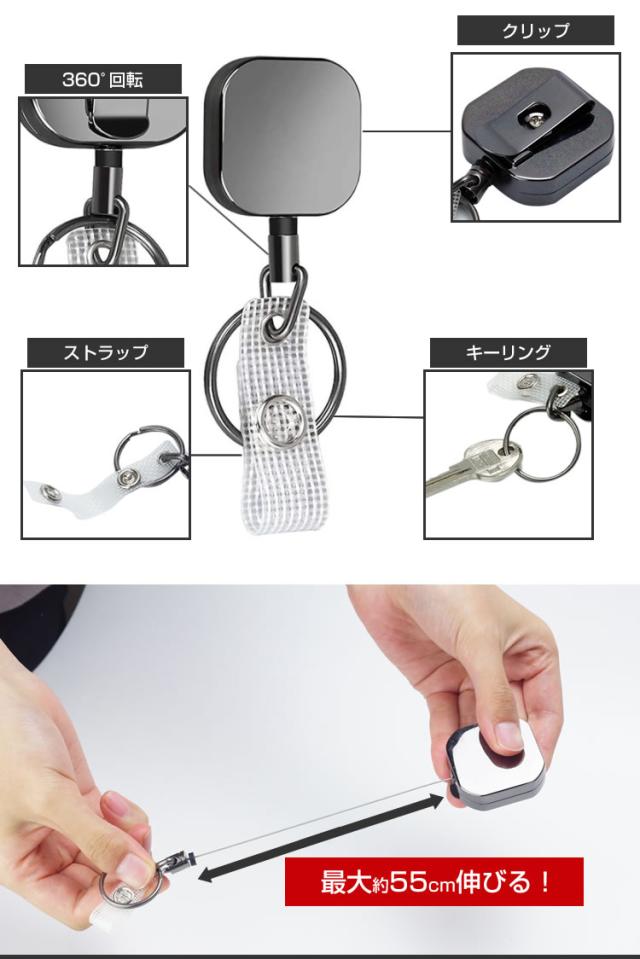 約55cmまで伸びるので、身につけたままカギなどを開けることができます。
