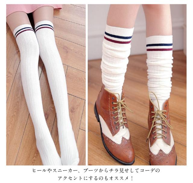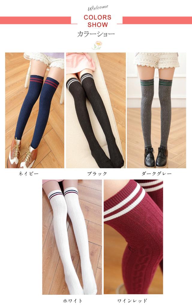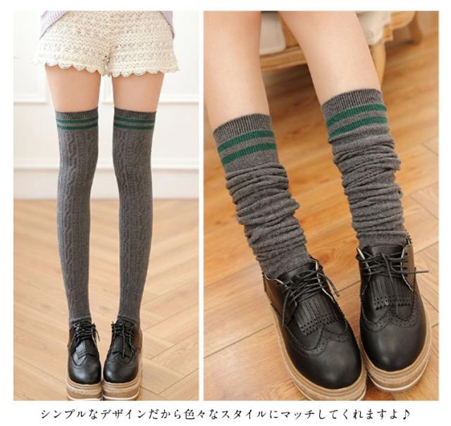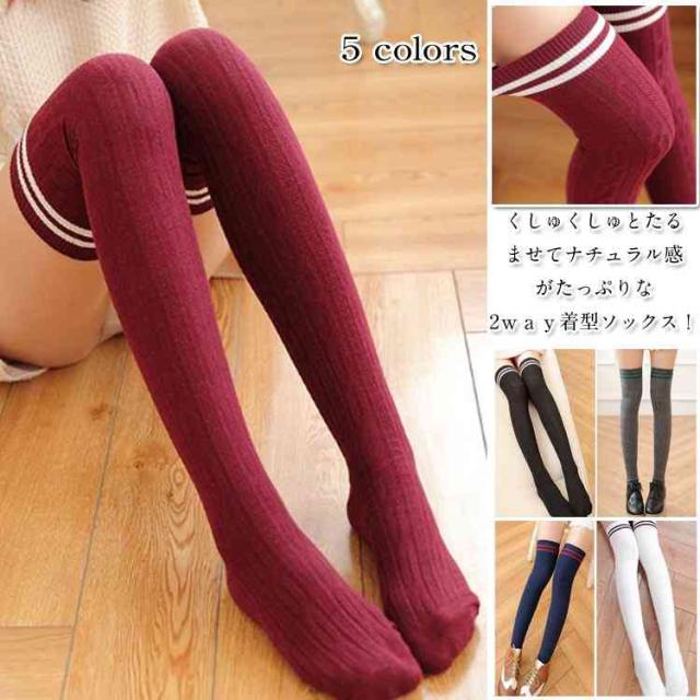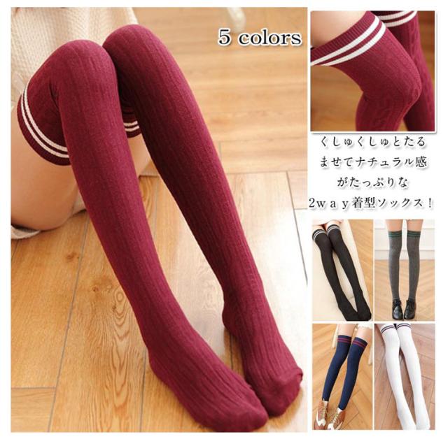2本ライン入れニーハイソックス 靴下 2way着型 オーバーニーソックス ボーダーソックス くしゅくしゅソックス ケーブル編みソックス