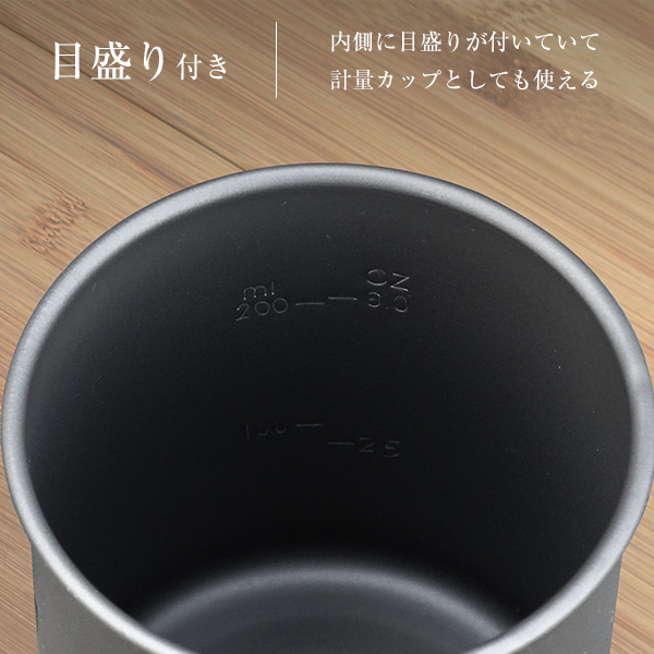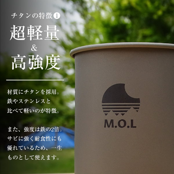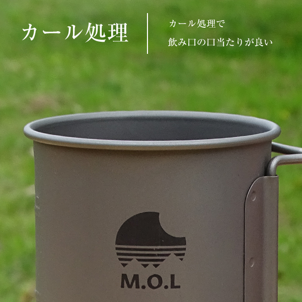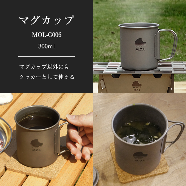 型番 MOL-G006 容量 300ml サイズ Φ7.5×8cm(ハンドル3cm) 重量 約60g 材質 チタン 付属品 収納袋