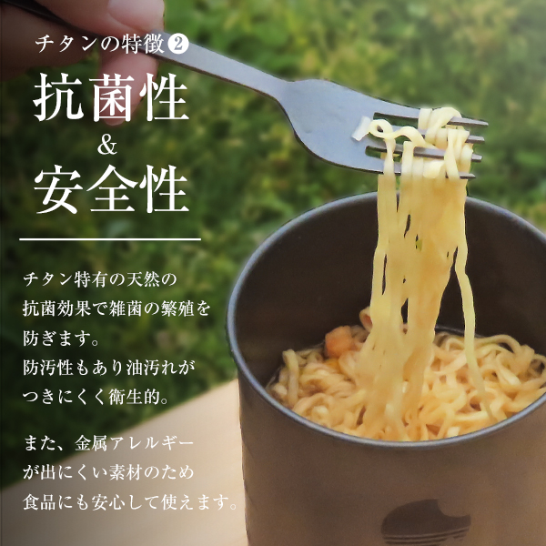 チタン特有の天然の抗菌効果で雑菌の繁殖を防ぎます。防汚性もあり油汚れがつきにくく衛生的。また、金属アレルギーが出にくい素材のため食品にも安心して使えます
