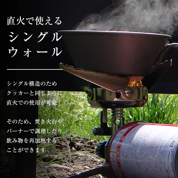 シングル構造のため直火での使用が可能。そのため、焚き火台やバーナーで調理したり飲み物を再加熱することができます