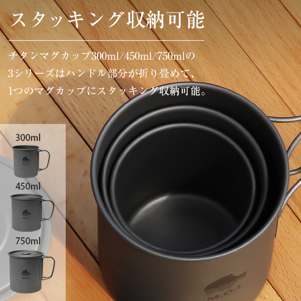 チタンマグカップ300ml/450ml/750mlの3シリーズはハンドル部分が折り畳めて、1つのマグカップにスタッキング収納可能。