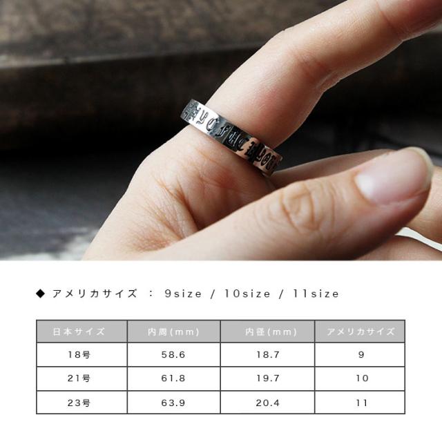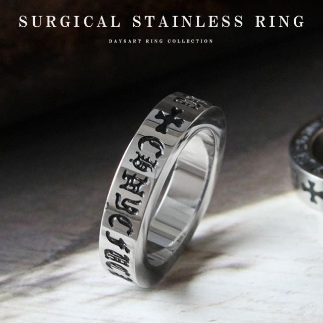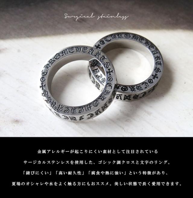 金属アレルギーが起こりにくい素材として注目されているサージカルステンレスを使用した、ゴシック調クロスと文字のリング。「錆びにくい」「高い耐久性」「腐食や熱に強い」という特徴があり、夏場のオシャレや水をよく触る方にもオススメ。美しい状態で長く愛用できます。