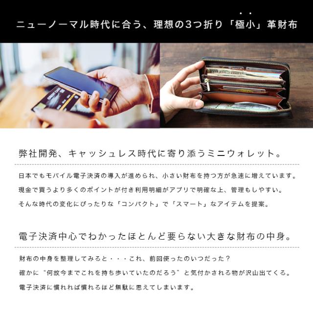 お札、小銭、カードをまとめてコンパクトに持ち運べるように設計されており、手の平サイズの無駄のない作りになっています。必要最低限のものが一通り収納できます。普段使いの財布としてはもちろん、カード類が多い方はカードケースと併用するのもおすすめです。