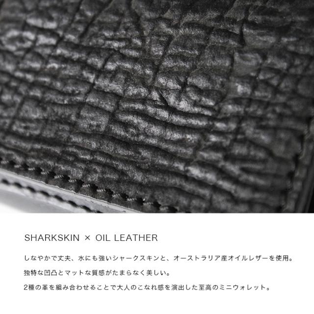 日々魅力が増していくエイジングを存分に楽しめる、オーストラリア産プルアップオイルレザーを使用した本革仕様のミニウォレットです。小銭入れ、背面カード収納部分には希少な本物のサメ皮をアクセントに使用しています。グレイシング加工による上品な艶が美しく、エイジングにより深み・渋みなどの味わい深さが増していきます。