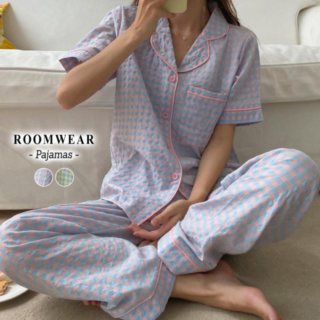 春新作 ルームウェア 春夏 レディース 可愛い パジャマ 上下セット 半袖 トップス パンツ 2点セット ギンガムチェック パステルカラー チェックパジャマ 婦人 デイリー 部屋着 寝巻き 薄手 ポケット付き ゆったり ウエストゴム 前開き フロントボタン