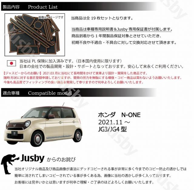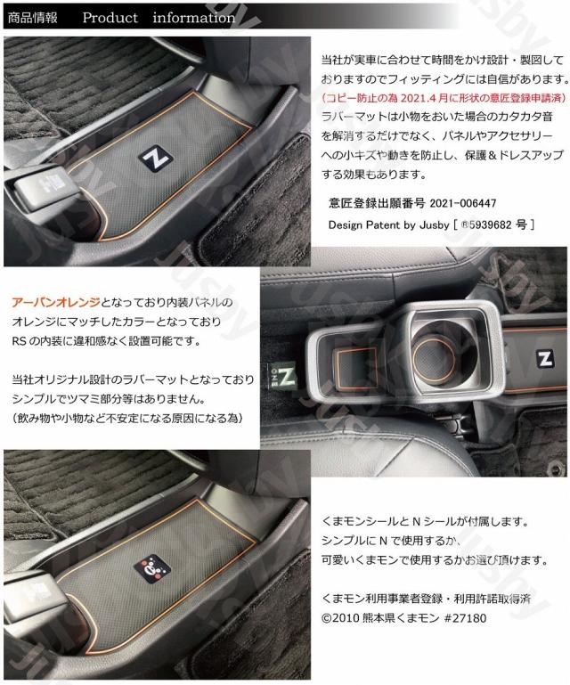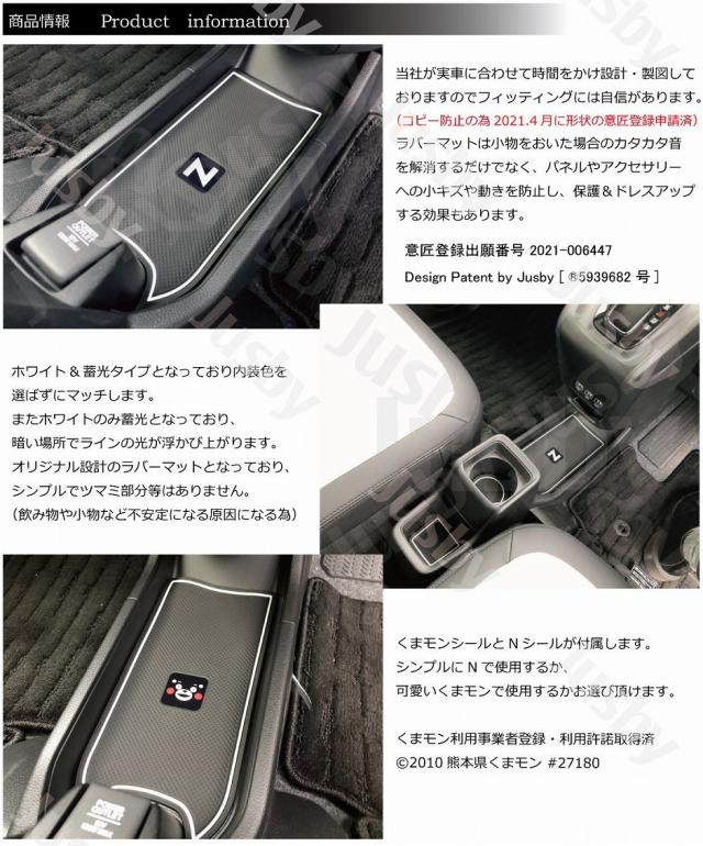 | N-ONE JG3 JG4 専用 インテリアラバーマット(ホワイト or アーバンオレンジ)です。 2020.11月発売の新型N-ONE専用のインテリアラバーマット ポケット 1式セットです。 スマートフォン等を置く場合等運転中のカタカタ音の防止やパネルへの傷防止、ドレスアップに最適です。 ・ホワイトタイプはホワイトラインが蓄光となっており、白ライン部の蓄光した箇所は暗くなると光ります。トンネルに入った際など格好良く光のラインが浮かび上がります。 (通常時に光の当たる蓄光マットのみ暗い場所に入った際に光ります。(暗いトンネル・立駐等)夕方から発光を開始してしまう為、夕方や夜間は光りません) ・アーバンオレンジオレンジはN-ONE RSの内装にマッチし、社内の統一感がアップしますので非常におすすめです。 ・Nとくまモンのシールが付属します。好きな方をご使用いただけます。 完全オリジナル設計で時間をかけCADにて製図して製作しておりますのでフィッティングには自信があります。 取付説明書とJusby専用の製品保証書が必ず付属いたします。 1年間は不具合・不適合・初期不良に対しての製品保証を行いますのでご安心してお買い求めください。 「レビューで送料無料(ネコポス便)」は商品受取後にレビューを書いて頂く事が前提で送料無料となります。 レビュー記載期限や催促等は一切ございません♪ 「代金引換」はネコポスでの発送が不可な為、送料無料適用外ですのでご注意下さい。 ( ・∀・)Φスタッフレビュー 専用設計なのでフィッティングがとにかく良く、純正の様に見えます。 携帯電話等車で充電しながらそのまま置いていた部分にもラバーマットで保護できる為、携帯電話及び車両パネルにも優し満足度が高い逸品です。 Jusbyオリジナル商品ですデッドコピー防止の為、意匠登録申請済みです。(特許庁HPにてご確認ください)デッドコピーには「業者」及びコピー目的での購入者「個人」へ請求させていただきます。 本?品已經向日本專利廳申請外型專利中 若有〓冒將採取法律行動並向亞馬遜檢舉 Design Patent by Jusby [ 〓5939682 号] |