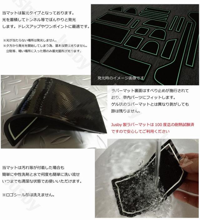 ・ホワイトタイプはホワイトラインが蓄光となっており、白ライン部の蓄光した箇所は暗くなると光ります。トンネルに入った際など格好良く光のラインが浮かび上がります。(通常時に光の当たる蓄光マットのみ暗い場所に入った際に光ります。(暗いトンネル・立駐等)夕方から発光を開始してしまう為、夕方や夜間は光りません)