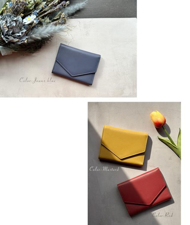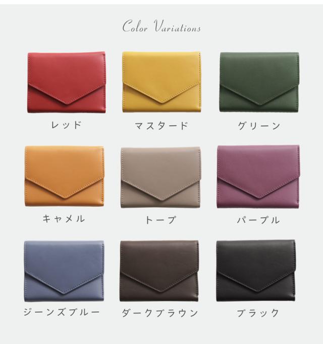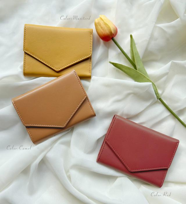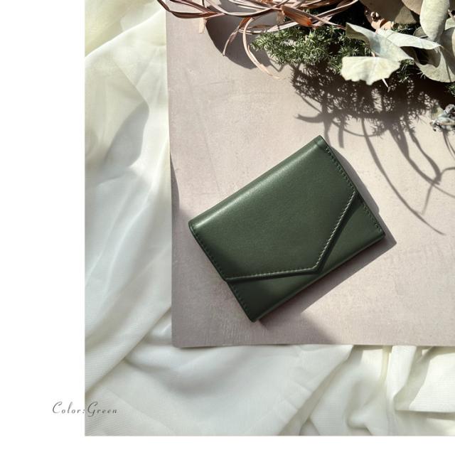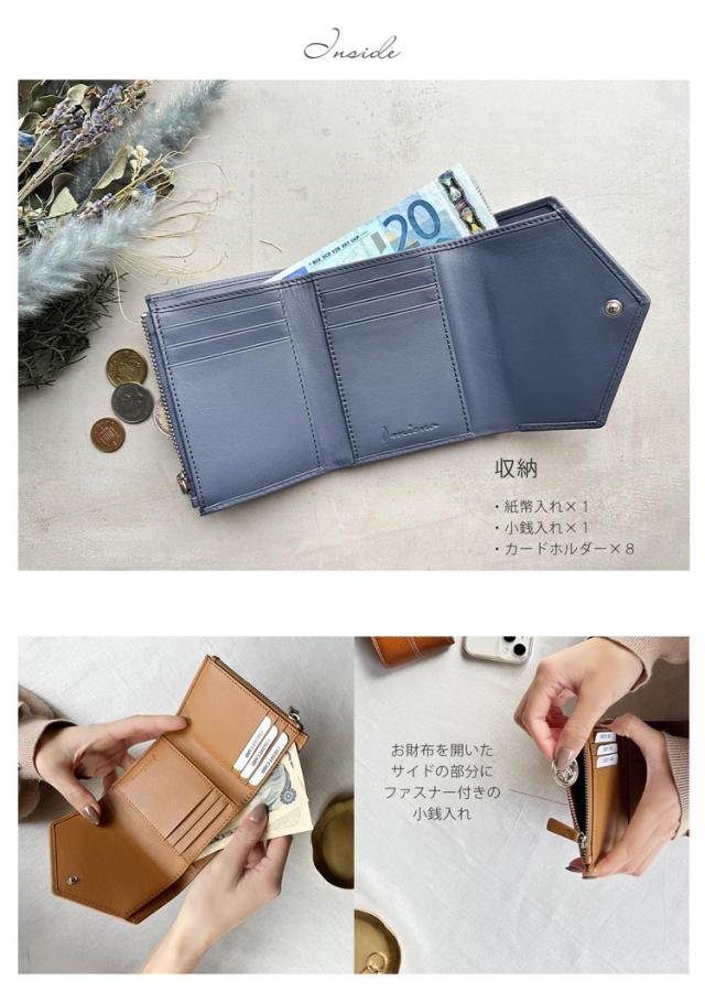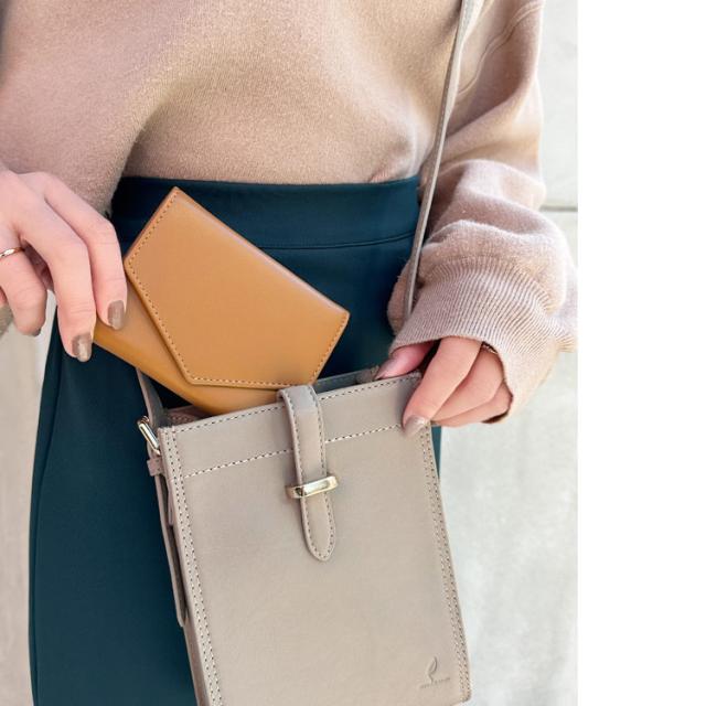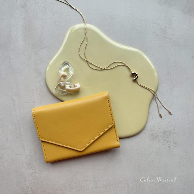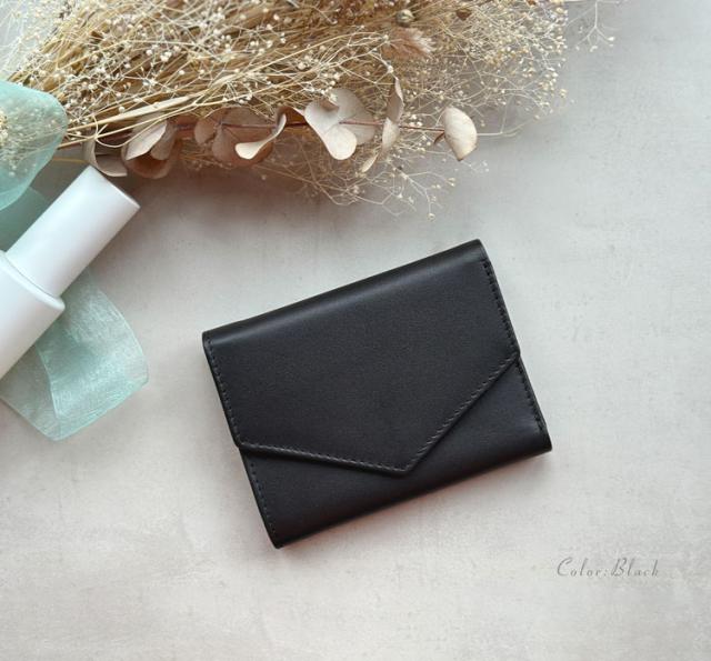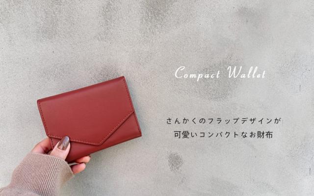 三角のフラップデザインがすっきりとした印象を与えるコンパクト財布。