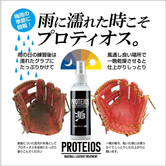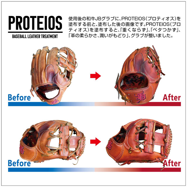 特徴:PROTEIOSとは和牛JBグラブの販売開始から3年。グラブ素材のこだわりを持って長い年月をかけて研究・開発をしたトリートメント剤のことです。