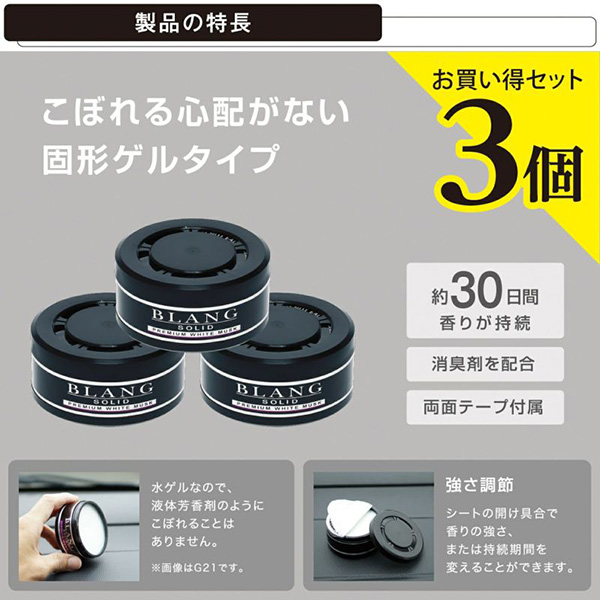 カーメイト 芳香剤 ブラング ソリッド3P プレミアムホワイトムスク 置き型 水ゲルタイプ こぼれない 車内 消臭効果 G1831T