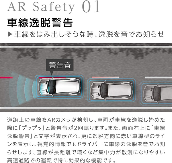 ■ARカメラで撮影したリアルタイム映像に、ナビ情報や安全支援情報を重ねて表示。目の前にある世界を”仮想的に拡張”してより分かりやすい「ルート案内」「安全運転支援」を行う新感覚ナビゲーションです。