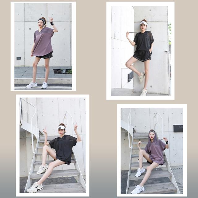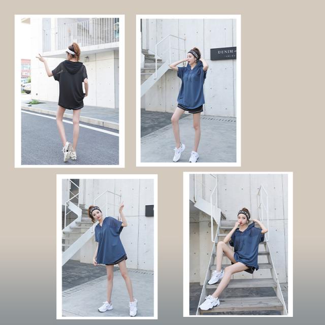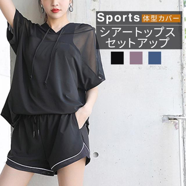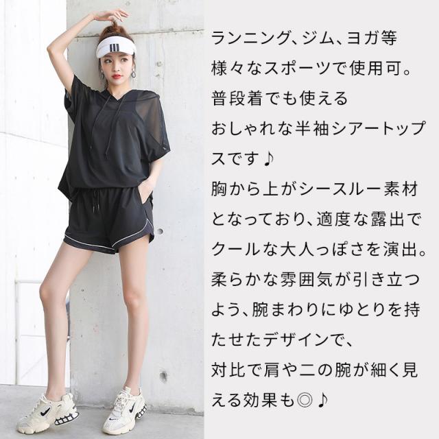 トレーニングウェア レディース 上下 半袖 セットアップ トップス パンツ 上下セットランニングウェア ビッグシルエット ストレッチ ゆったり 大きいサイズ プラスサイズ スポーツウェア フィットネスウェア ヨガウェア ジムウェア パーカー シースルー