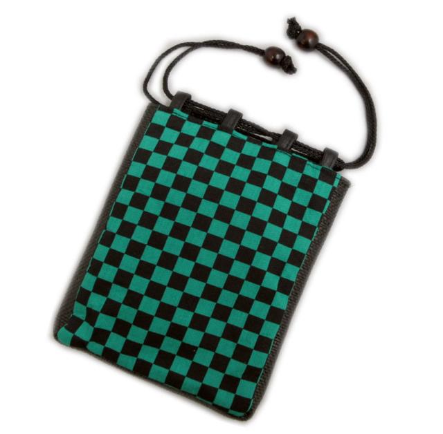信玄袋 ミニ 巾着 バッグ 小物入れ 緑黒市松 マチ編込 木玉付 メンズ 男性 キッズ 浴衣 着物 鬼滅の刃風 スマホ入れ