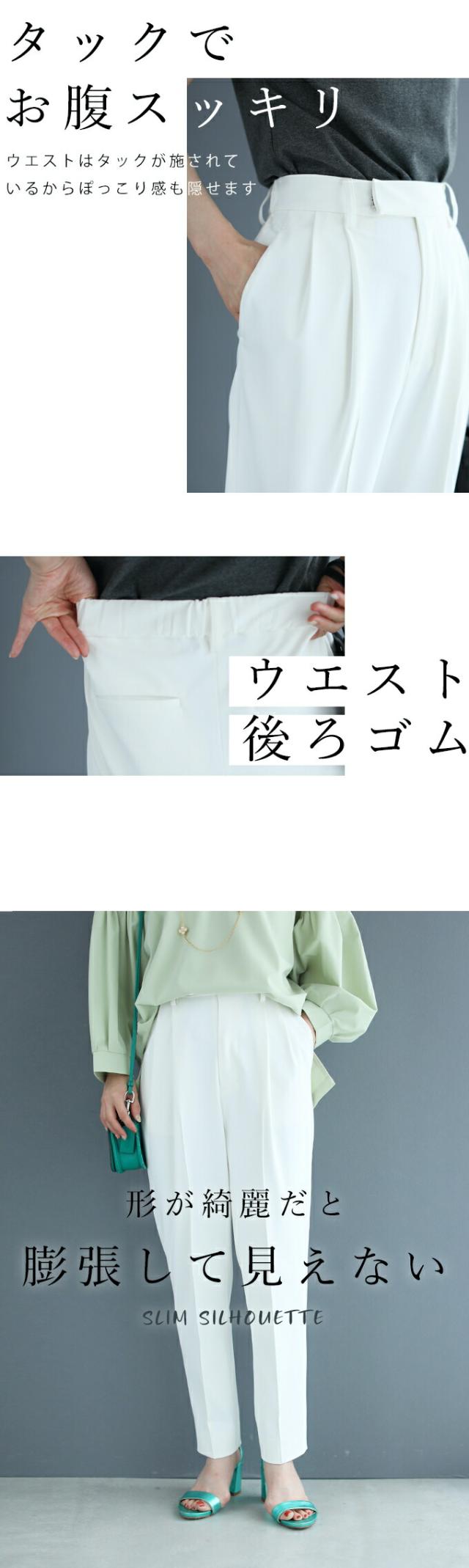 白なのに汚れにくいタックパンツ 撥水加工 fcj00022 S~M L~2L 3L~4L cawaii ストレッチ テーパードパンツ バックゴム 春 夏新作 新作 白パンツ センタープレス 撥水パンツ 機能性パンツ 汚れ防止 ストレート セミワイド クロップドパンツ ウエストゴム 洗える 無地 予約