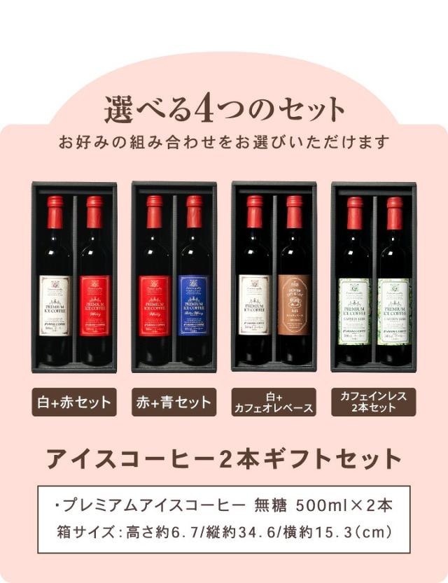 | セット内容 | 下記よりセット内容をご選択いただけます。 ●白+赤セット ・プレミアムアイスコーヒー 無糖 500ml×1本(白ラベル) ・プレミアムアイスコーヒー ワイニー 無糖 500ml×1本(赤ラベル) ●赤+青セット ・プレミアムアイスコーヒー ワイニー 無糖 500ml×1本(赤ラベル) ・プレミアムアイスコーヒー ビターワイニー 無糖 500ml×1本(青ラベル) ●白+カフェオレベース ・プレミアムアイスコーヒー 無糖 500ml×1本(白ラベル) ・プレミアムカフェオレベース 無糖 500ml×1本(希釈タイプ) ●カフェインレス2本セット ・プレミアムアイスコーヒー カフェインレス 無糖 500ml×2本 |