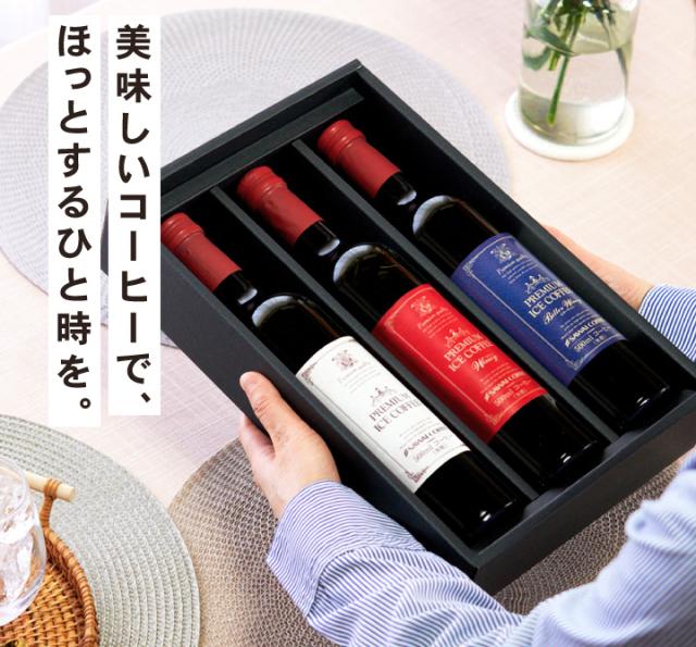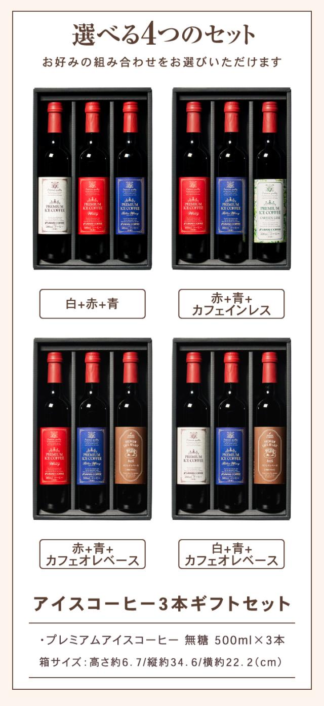 | セット内容 | 下記よりセット内容をご選択いただけます。 ●白+赤+青セット ・プレミアムアイスコーヒー 無糖 500ml×1本(白ラベル) ・プレミアムアイスコーヒー ワイニー 無糖 500ml×1本(赤ラベル) ・プレミアムアイスコーヒー ビターワイニー 無糖 500ml×1本(青ラベル) ●赤+青+カフェインレスセット ・プレミアムアイスコーヒー ワイニー 無糖 500ml×1本(赤ラベル) ・プレミアムアイスコーヒー ビターワイニー 無糖 500ml×1本(青ラベル) ・プレミアムアイスコーヒー カフェインレス 無糖 500ml×1本 ●赤+青+カフェオレベースセット ・プレミアムアイスコーヒー ワイニー 無糖 500ml×1本(赤ラベル) ・プレミアムアイスコーヒー ビターワイニー 無糖 500ml×1本(青ラベル) ・プレミアムカフェオレベース 無糖 500ml×1本(希釈タイプ) ●白+青+カフェオレベースセット ・プレミアムアイスコーヒー 無糖 500ml×1本(白ラベル) ・プレミアムアイスコーヒー ビターワイニー 無糖 500ml×1本(青ラベル) ・プレミアムカフェオレベース 無糖 500ml×1本(希釈タイプ) |