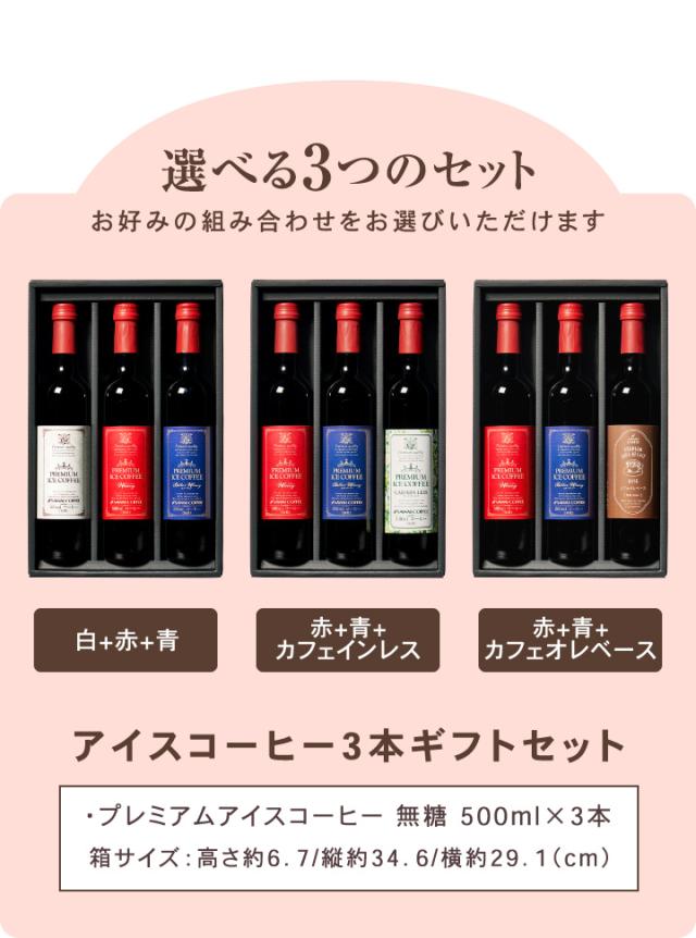 | セット内容 | 下記よりセット内容をご選択いただけます。 ●白+赤+青セット ・プレミアムアイスコーヒー 無糖 500ml×1本(白ラベル) ・プレミアムアイスコーヒー ワイニー 無糖 500ml×1本(赤ラベル) ・プレミアムアイスコーヒー ビターワイニー 無糖 500ml×1本(青ラベル) ●赤+青+カフェインレスセット ・プレミアムアイスコーヒー ワイニー 無糖 500ml×1本(赤ラベル) ・プレミアムアイスコーヒー ビターワイニー 無糖 500ml×1本(青ラベル) ・プレミアムアイスコーヒー カフェインレス 無糖 500ml×1本 ●赤+青+カフェオレベースセット ・プレミアムアイスコーヒー ワイニー 無糖 500ml×1本(赤ラベル) ・プレミアムアイスコーヒー ビターワイニー 無糖 500ml×1本(青ラベル) ・プレミアムカフェオレベース 無糖 500ml×1本(希釈タイプ) ●白+青+カフェオレベースセット ・プレミアムアイスコーヒー 無糖 500ml×1本(白ラベル) ・プレミアムアイスコーヒー ビターワイニー 無糖 500ml×1本(青ラベル) ・プレミアムカフェオレベース 無糖 500ml×1本(希釈タイプ) |