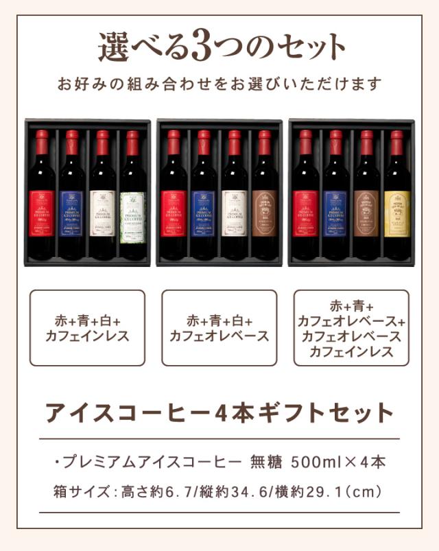 | セット内容 | 下記よりセット内容をご選択いただけます。 ●赤+青+白+カフェインレスセット ・プレミアムアイスコーヒー ワイニー 無糖 500ml×1本(赤ラベル) ・プレミアムアイスコーヒー ビターワイニー 無糖 500ml×1本(青ラベル) ・プレミアムアイスコーヒー 無糖 500ml×1本(白ラベル) ・プレミアムアイスコーヒー カフェインレス 無糖 500ml×1本 ●赤+青+白+カフェオレベースセット ・プレミアムアイスコーヒー ワイニー 無糖 500ml×1本(赤ラベル) ・プレミアムアイスコーヒー ビターワイニー 無糖 500ml×1本(青ラベル) ・プレミアムアイスコーヒー 無糖 500ml×1本(白ラベル) ・プレミアムカフェオレベース 無糖 500ml×1本(希釈タイプ) ●赤+青+カフェオレベース+カフェオレベースカフェインレスセット ・プレミアムアイスコーヒー ワイニー 無糖 500ml×1本(赤ラベル) ・プレミアムアイスコーヒー ビターワイニー 無糖 500ml×1本(青ラベル) ・プレミアムカフェオレベース 無糖 500ml×1本(希釈タイプ) ・プレミアムカフェオレベース カフェインレス 無糖 500ml×1本(希釈タイプ) |