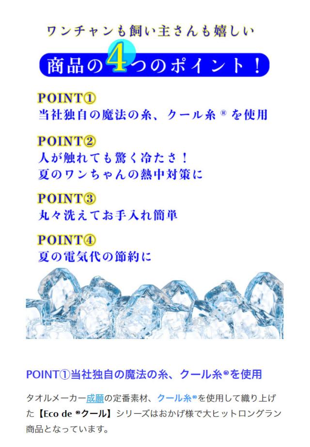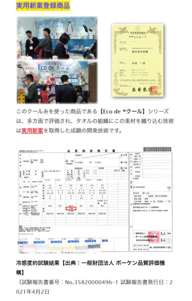 このクール糸を使った商品である【Eco de (R)クール】シリーズは、多方面で評価され、タオルの組織にこの素材を織り込む技術は 実用新案 を取得した成願の開発技術です。