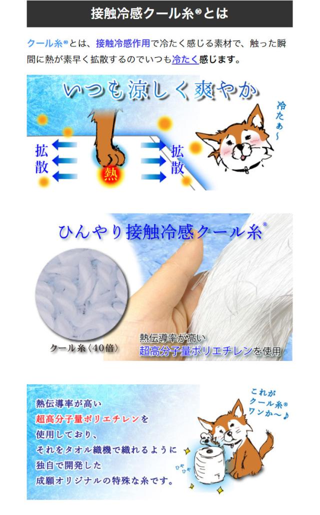 クール糸(R) とは、 接触 冷感作用 で冷たく感じる素材です。触った瞬間に熱が素早く拡散するので冷たく感じます。