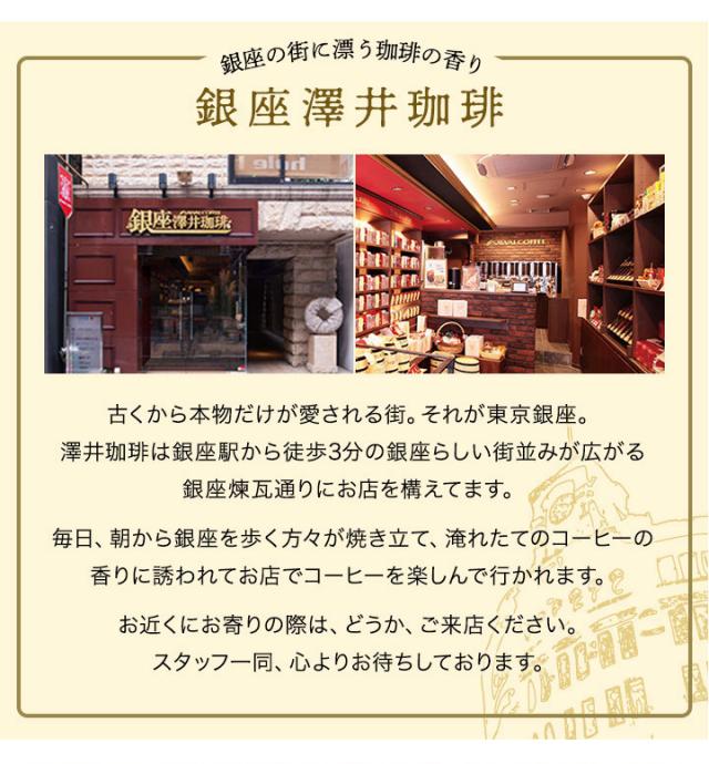 | こんな方にオススメです | 1. お洒落なギフトを探している方 高級なパッケージと箱は、特別なイベントやプレゼントのお返し、内祝い等どんな場面のギフトにもぴったりです。 2. 銀座に赴いたことのない方へ 銀座澤井珈琲で愛される味わいと銀座をイメージしたパッケージは高級感溢れる銀座の街にいるような気分になれます。 3. 新しい味わいを試してみたい方 今までに味わったことのないコーヒーを試したい方にもおすすめです。本来銀座でしか味わえないブレンドがこのセットで飲み味わえます。 |