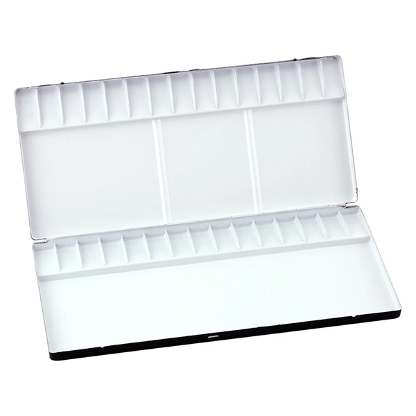 水彩やデザイン用の絵具は油絵具と比べやわらかく、しかも水でうすめて使用することが多いので、色別の仕切りや、混色皿の仕切りがついたものが便利です。