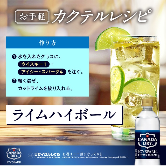 そのままで!割り材で!無糖・強炭酸水『アイシー・スパーク from カナダドライ』は、そのままのストレート飲用はもちろん、割り材にもぴったりな無糖の強炭酸水です。