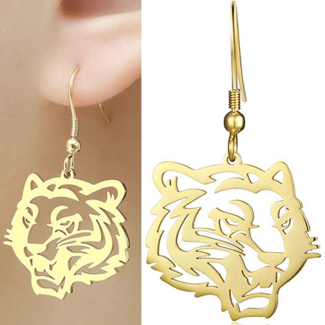 金色の虎の顔をモチーフにしたチャームが揺れるおしゃれなステンレスピアス。
